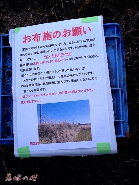 勝手に草刈して、さらに後から来た侵入者に対してはカンパという名のお布施を要求し、