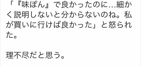 【理不尽】妻「ポン酢買ってきて。ポン酢よ。間違わないで」夫「わかった」→なんという理不尽