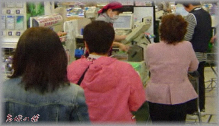 列を割り込んで、レジ台?(カゴを置く白い台)に自分のカゴを置いた